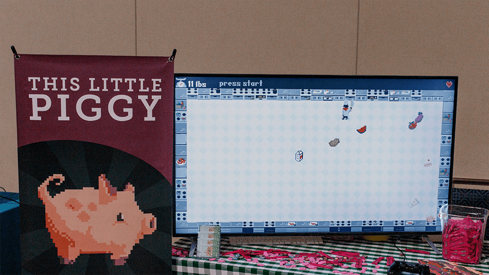Battlesloths (Invisible Collective) is a multiplayer twin-stick shooter supporting two to four players. The most popular game mode is one where you pick up pizza slices dropped by other players when they die and return them to your home base. The first player to make a whole pizza wins. The action is fast-paced, the arena is strewn with weapons, and the hats your sloth can wear are an ever-growing list of hilarity. This game walked away with runner-up for “Best Presence.”